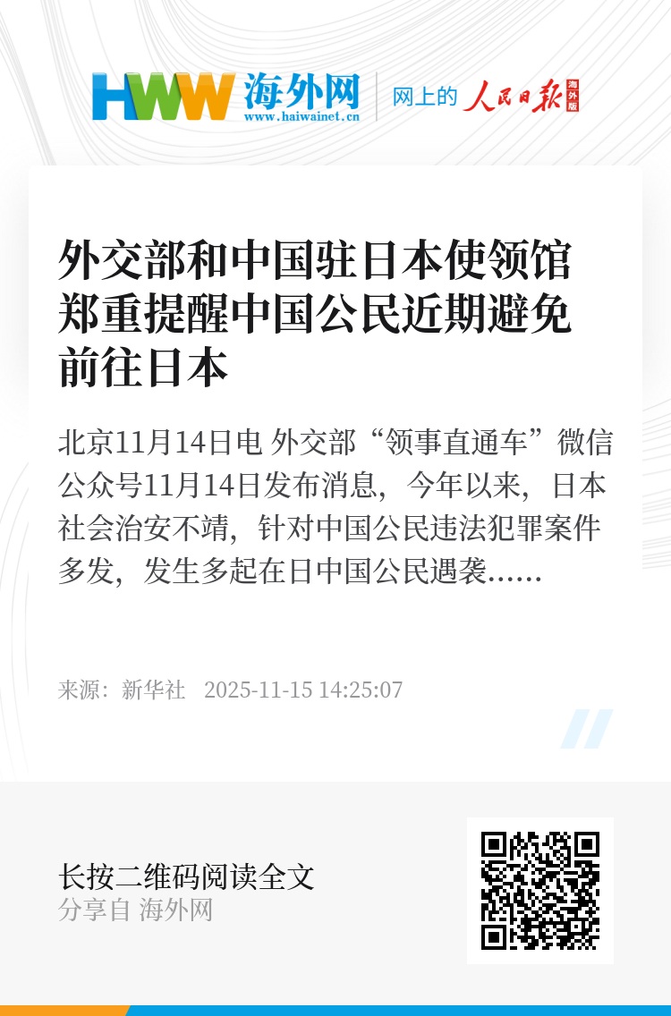 新华社北京11月14日电 外交部“领事直通车”微信公众号11月14日发布消息,今年以来,日本社会治安不靖,针对中国公民违法犯罪案件多发,发生多起在日中国公民遇袭事件,部分案件迄未侦破,中国公民在日本安全环境持续恶化。近日,日本领导人公然发表涉台露骨挑衅言论,严重恶化中日人员交流氛围,给在日中国公民人身和生命安全带来重大风险。