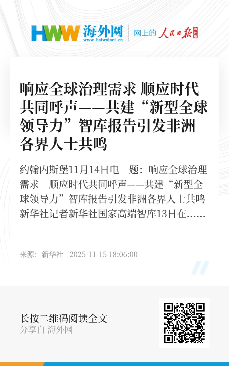 新华社约翰内斯堡11月14日电 题:响应全球治理需求 顺应时代共同呼声——共建“新型全球领导力”智库报告引发非洲各界人士共鸣