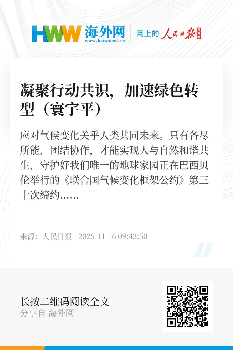 正在巴西贝伦举行的《联合国气候变化框架公约》第三十次缔约方大会(COP30),承载着各方开启“加速发展和落实行动的十年”的共同期待。作为大会重要铺垫,贝伦气候峰会达成《贝伦宣言》,呼吁更公正、更具包容性的气候行动,彰显各方团结应对气候危机的决心。当前,全球气候治理进入关键阶段,国际社会亟须凝聚合力,以切实行动发出全球绿色低碳转型不可逆转的明确信号。