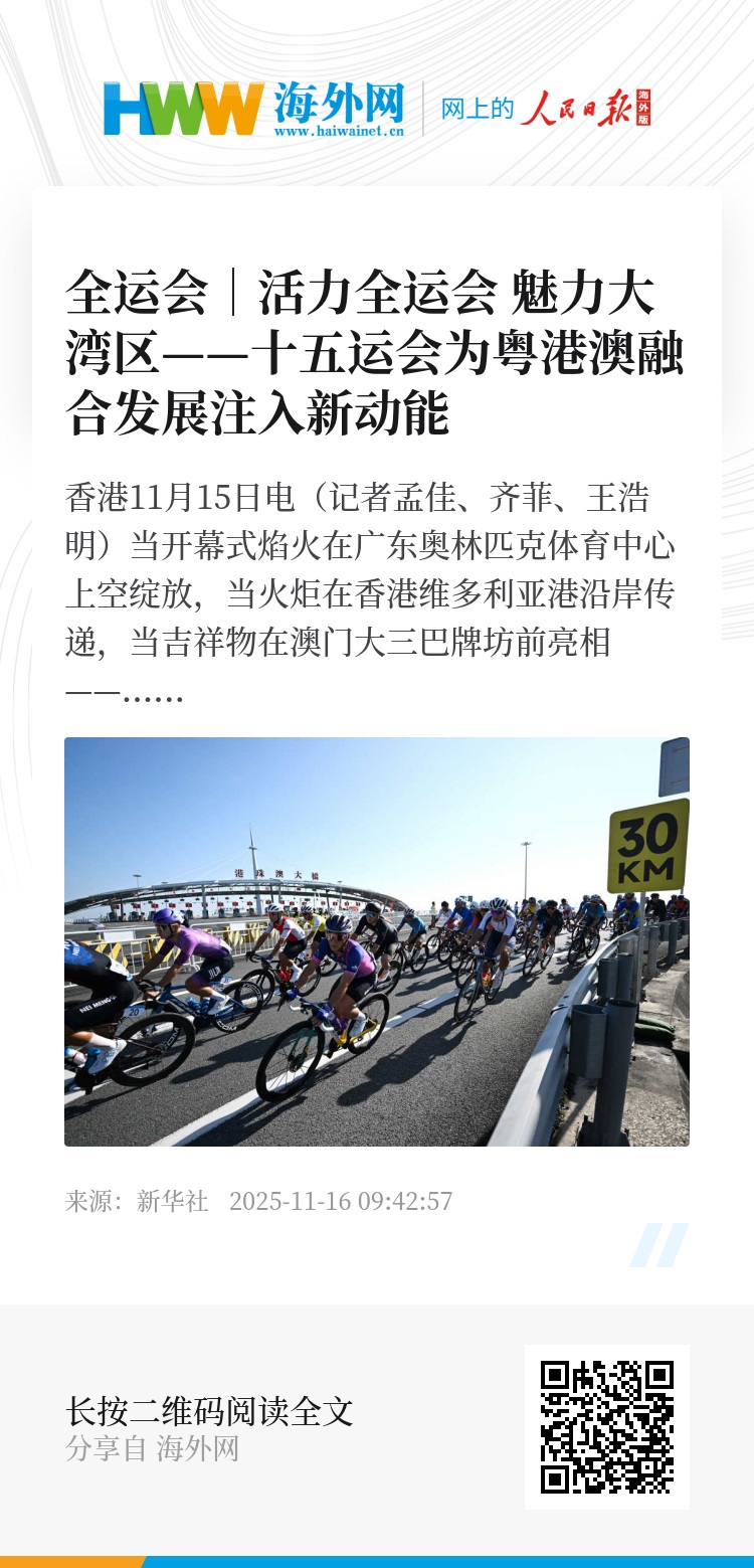 不只是马拉松,跨越粤港澳、全运会历史上首个跨境比赛——公路自行车男子个人赛8日顺利完赛,引发热议。车队从珠海博物馆出发,驰骋港珠澳大桥,经过澳门再到香港,海风过耳与观众的加油呐喊交织成壮阔乐章。