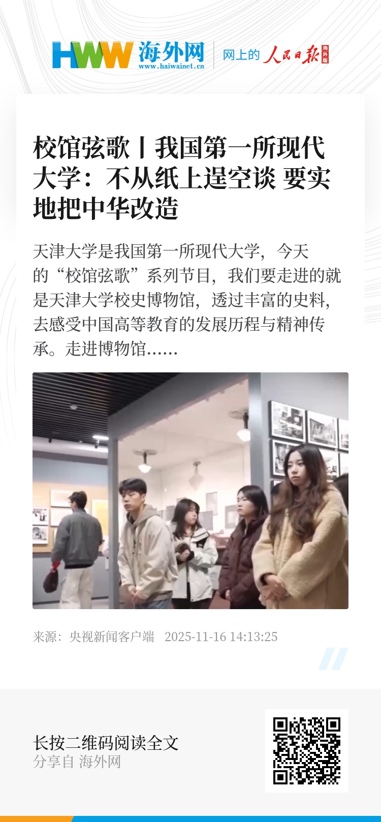 一座校史馆,也是一条精神纽带,曾经一届届参观的学生,一批批志愿者讲解员,如今有的成为学术中坚,有的成为科研骨干。在大科学装置、水下滑翔机、智能电网、脑机接口等各领域,天大人正接力前行,展现新时代的使命与担当。