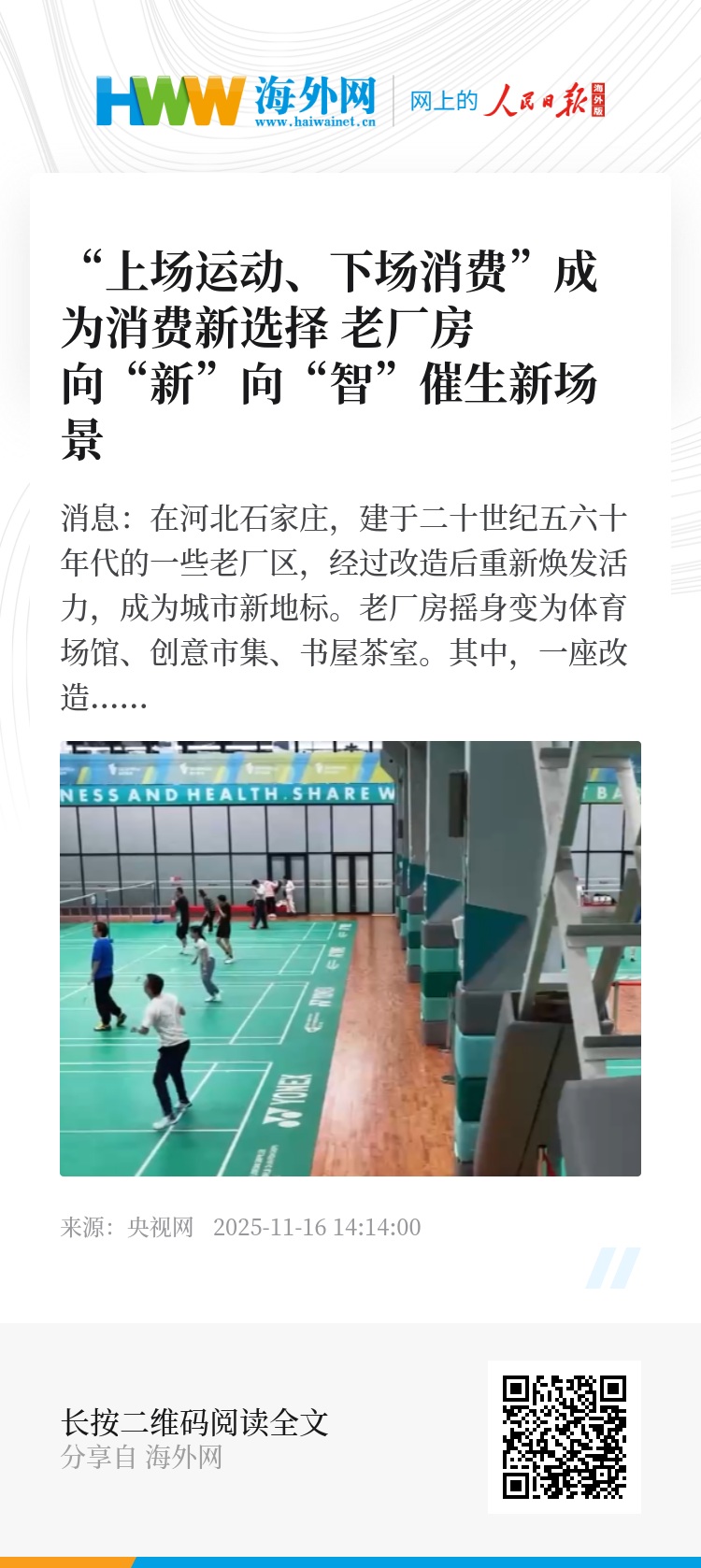 央视网消息:在河北石家庄,建于二十世纪五六十年代的一些老厂区,经过改造后重新焕发活力,成为城市新地标。老厂房摇身变为体育场馆、创意市集、书屋茶室。其中,一座改造后的体育场馆人气就颇高,24小时全天候营业、智能化设施,完善的商业配套成为最大亮点,也让“上场运动、下场消费”成为消费者的一种新选择。
