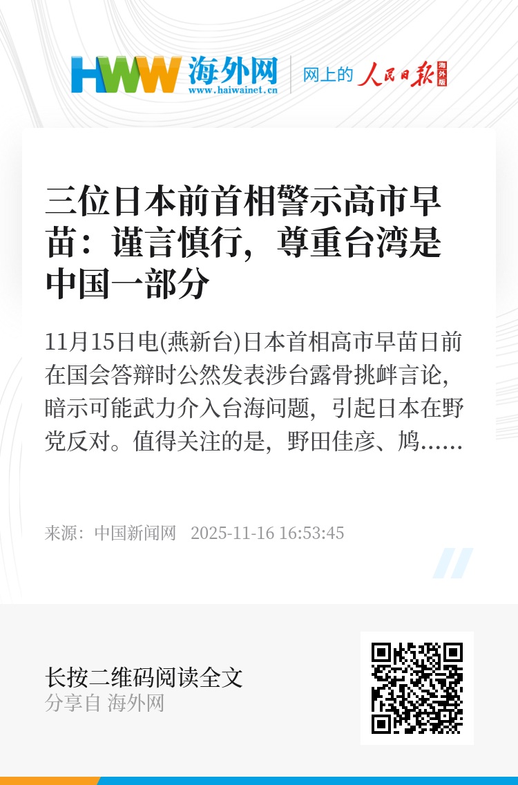 中新网11月15日电(燕新台)日本首相高市早苗日前在国会答辩时公然发表涉台露骨挑衅言论,暗示可能武力介入台海问题,引起日本在野党反对。值得关注的是,野田佳彦、鸠山由纪夫及石破茂三位日本前首相,也先后对高市早苗挑衅言论发出警示。