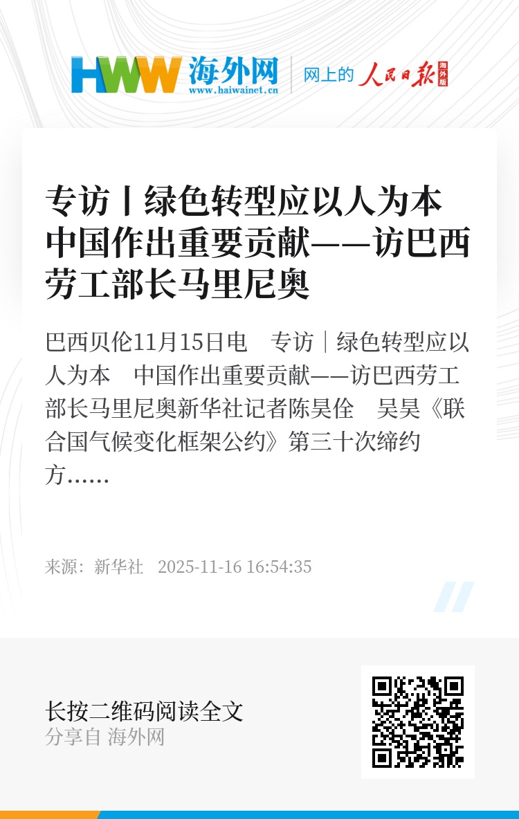 新华社巴西贝伦11月15日电 专访|绿色转型应以人为本 中国作出重要贡献——访巴西劳工部长马里尼奥