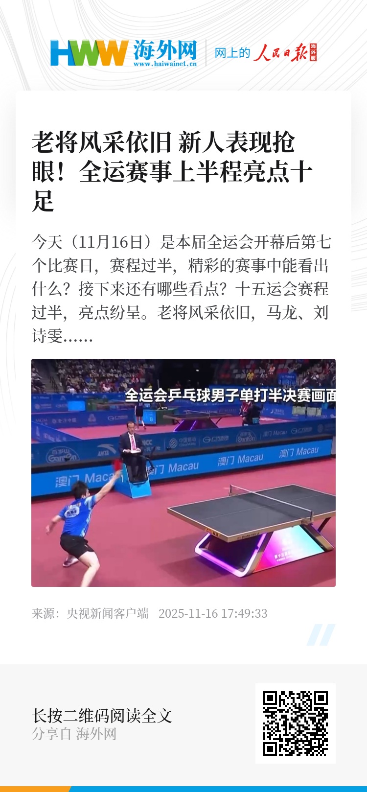 后半程赛事同样精彩可期:将决出田径男女百米“飞人大战”冠军、女排成年组金牌,以及羽毛球、网球各单项、乒乓球男女团冠军。闭幕式当天,女子水球项目将产生本届全运会最后一枚金牌。