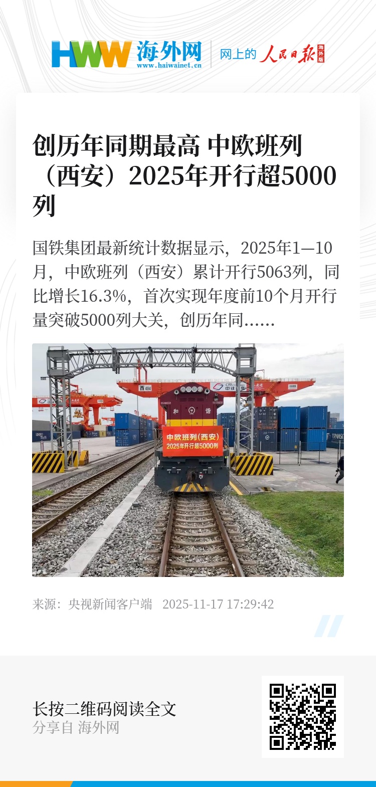 国铁集团最新统计数据显示,2025年1—10月,中欧班列(西安)累计开行5063列,同比增长16.3%,首次实现年度前10个月开行量突破5000列大关,创历年同期最高纪录。开行量、货运量、重箱率等核心指标持续稳居全国前列。