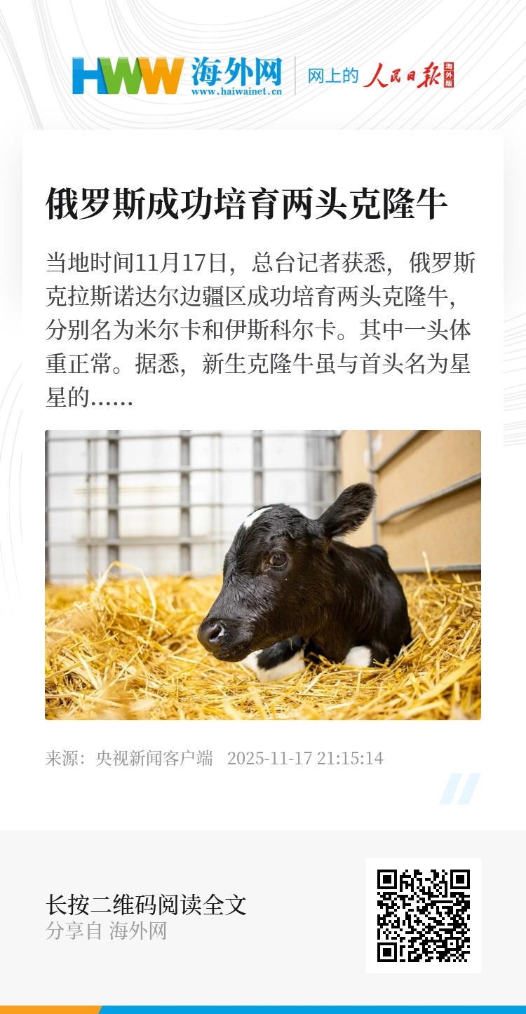 当地时间11月17日,总台记者获悉,俄罗斯克拉斯诺达尔边疆区成功培育两头克隆牛,分别名为米尔卡和伊斯科尔卡。其中一头体重正常。