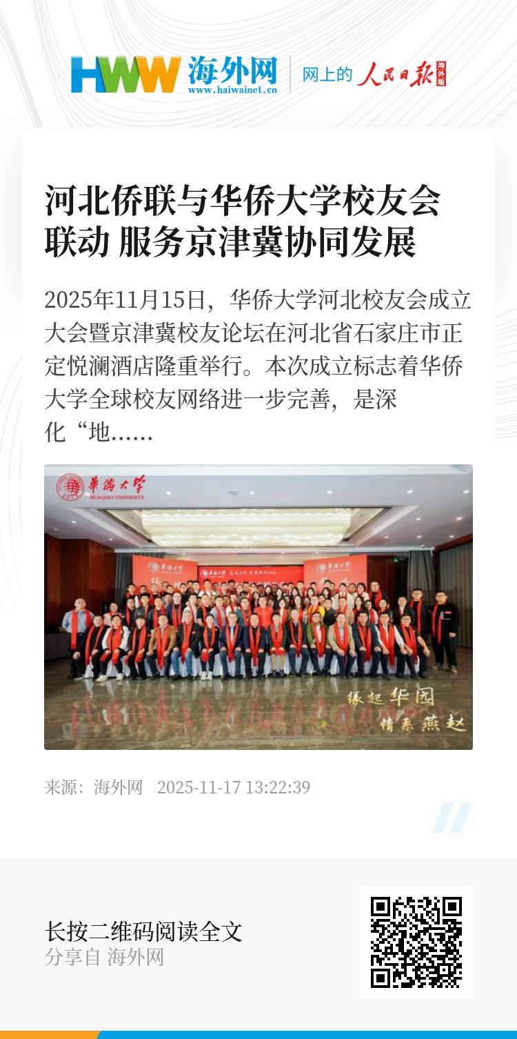 河北校友会的成立,为在燕赵大地的华大校友搭建了互帮互助、共同进步的平台,填补了京津冀及“山河四省”校友会布局的最后一块空白。该校友会将积极依托“地方侨联+高校侨联+校友会”联动机制,为广大华大校友到河北探亲访友、投资兴业提供开放合作窗口,为京津冀及海外侨界人才流动构建高效交流平台,为区域高质量发展注入新的侨界动能。