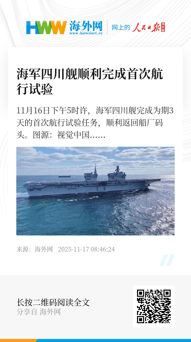 32909288,.海军四川舰顺利完成首次航行试验,.2025-11-17 08:46:24,.204428,.张青津、姚凯红
