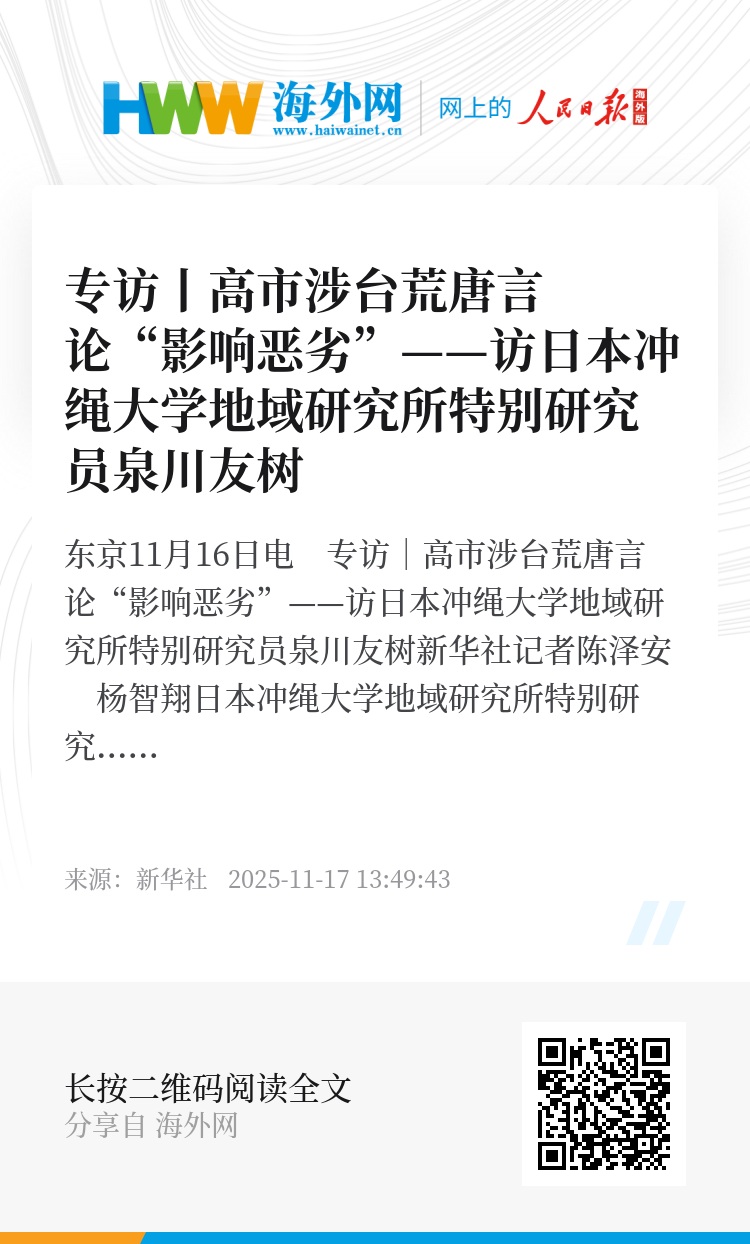 新华社东京11月16日电 专访|高市涉台荒唐言论“影响恶劣”——访日本冲绳大学地域研究所特别研究员泉川友树