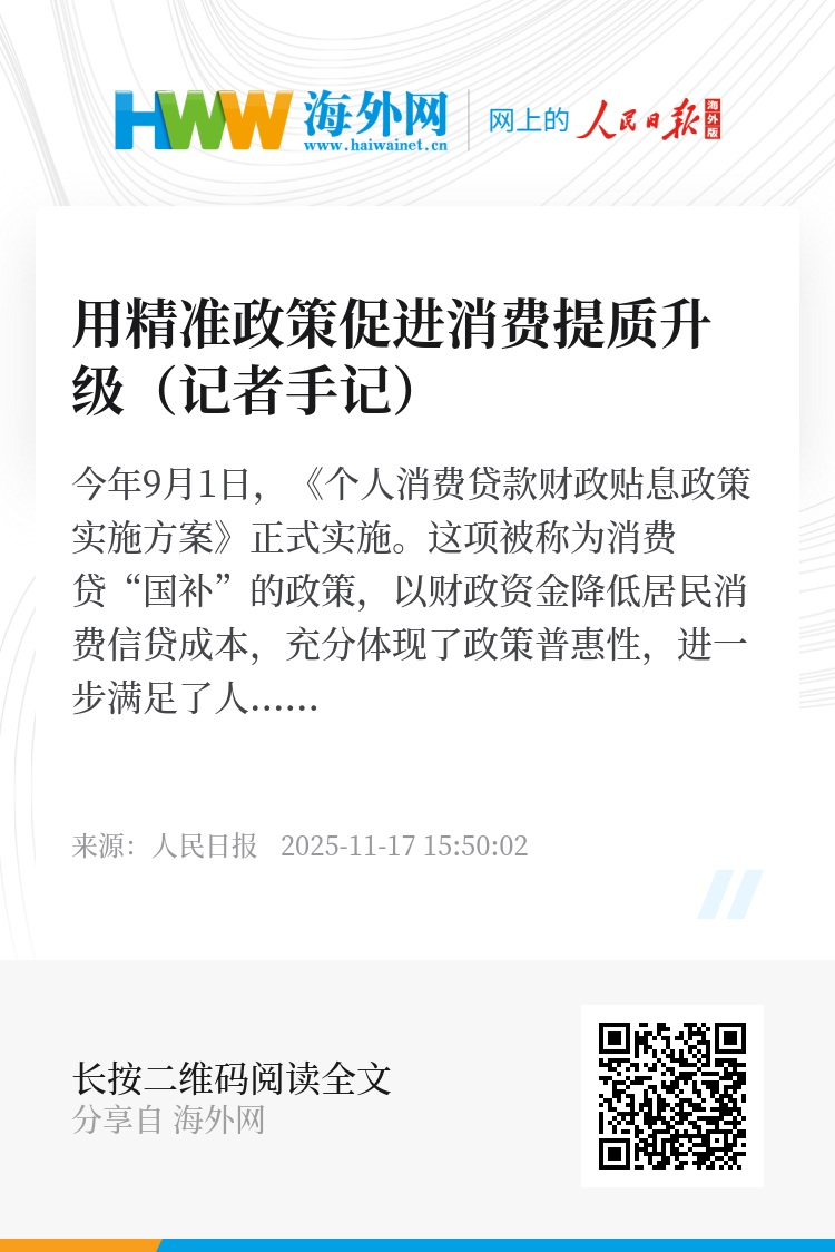 今年9月1日,《个人消费贷款财政贴息政策实施方案》正式实施。这项被称为消费贷“国补”的政策,以财政资金降低居民消费信贷成本,充分体现了政策普惠性,进一步满足了人民群众多元化、多层次的消费需求。“十五五”规划建议明确提出,加大直达消费者的普惠政策力度,增加政府资金用于民生保障支出。
