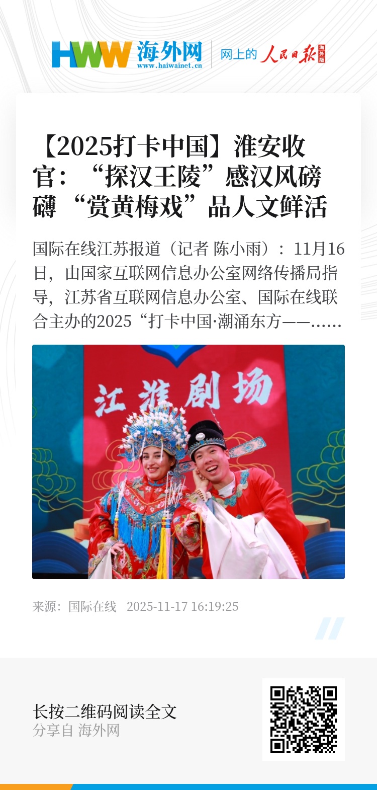 国际在线江苏报道(记者 陈小雨):11月16日,由国家互联网信息办公室网络传播局指导,江苏省互联网信息办公室、国际在线联合主办的2025“打卡中国·潮涌东方——你好江苏”网络国际传播活动淮安段迎收官之日。当日天朗气清,海外视频博主走进淮安盱眙,感受历史与现代交融的独特人文魅力。