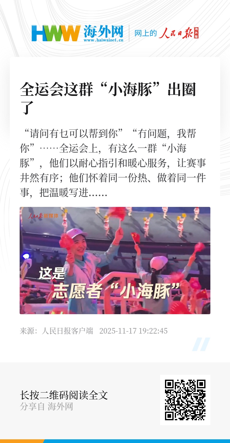 “请问有乜可以帮到你”“冇问题,我帮你”……全运会上,有这么一群“小海豚”,他们以耐心指引和暖心服务,让赛事井然有序;他们怀着同一份热、做着同一件事,把温暖写进粤港澳同心圆里。辛苦了“小海豚”,谢谢你们!