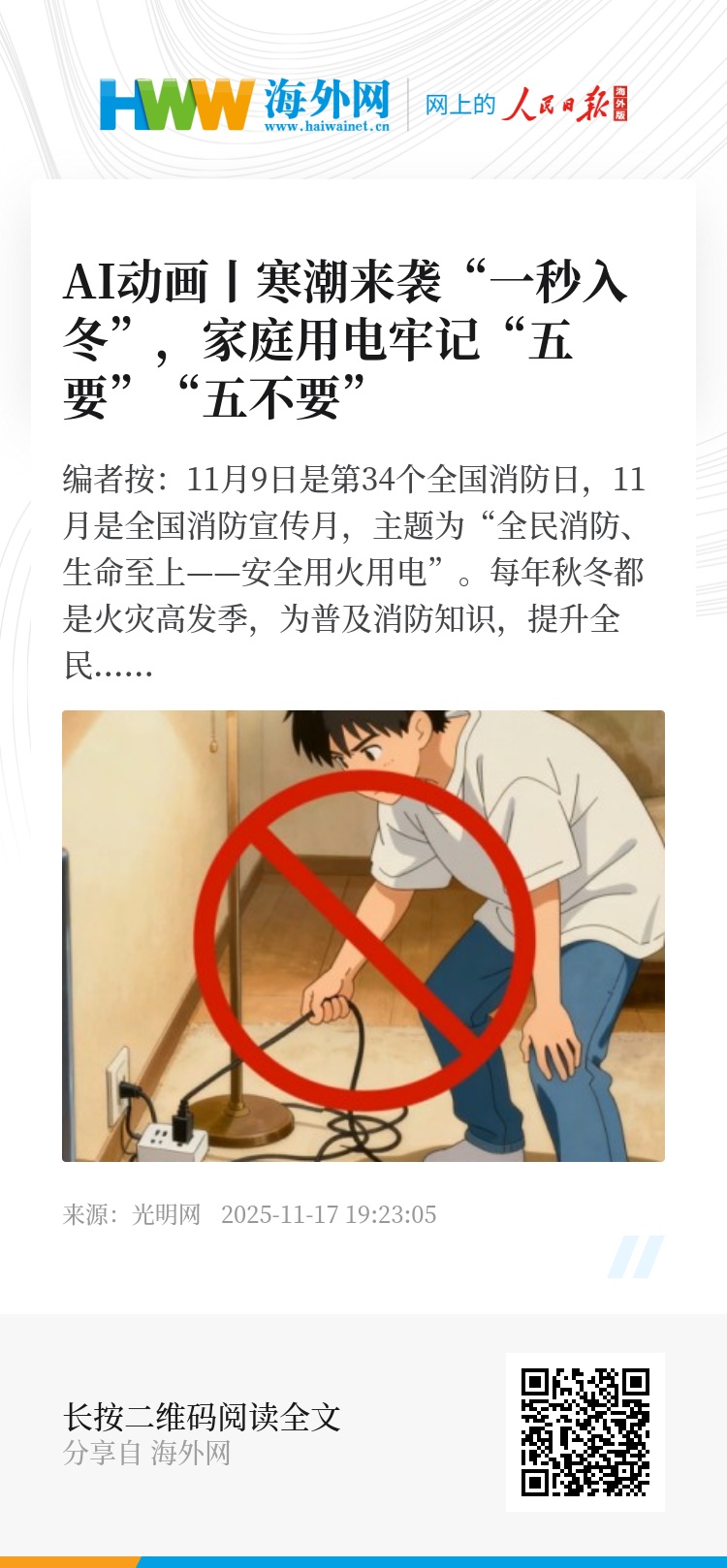 编者按:11月9日是第34个全国消防日,11月是全国消防宣传月,主题为“全民消防、生命至上——安全用火用电”。每年秋冬都是火灾高发季,为普及消防知识,提升全民安全意识,光明网、应急管理部新闻宣传司联合策划推出消防安全科普系列节目,针对不同场景下的消防安全,通过AI动画形式,为大家解析火灾隐患、警示安全风险、科普逃生技能。