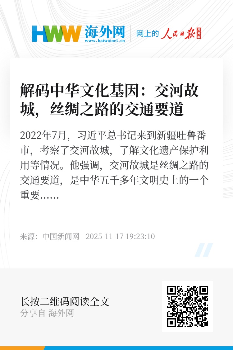 2022年7月,习近平总书记来到新疆吐鲁番市,考察了交河故城,了解文化遗产保护利用等情况。他强调,交河故城是丝绸之路的交通要道,是中华五千多年文明史上的一个重要见证,有重要史学价值。要加强文物保护利用和文化遗产保护传承,不断扩大中华文化国际影响力,增强民族自豪感、文化自信心。