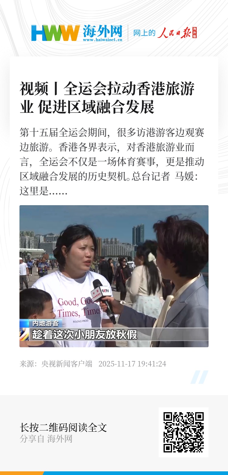 第十五届全运会期间,很多访港游客边观赛边旅游。香港各界表示,对香港旅游业而言,全运会不仅是一场体育赛事,更是推动区域融合发展的历史契机。