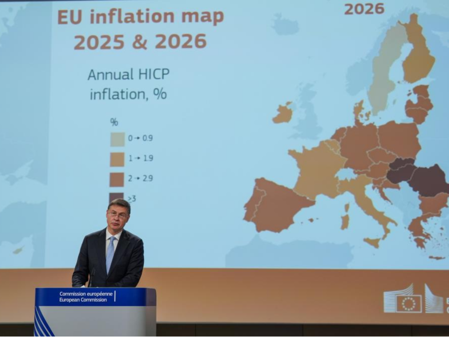 11月17日,欧盟委员会负责经济事务的委员东布罗夫斯基斯在比利时布鲁塞尔发布2025年秋季经济展望报告。新华社记者 彭子洋 摄