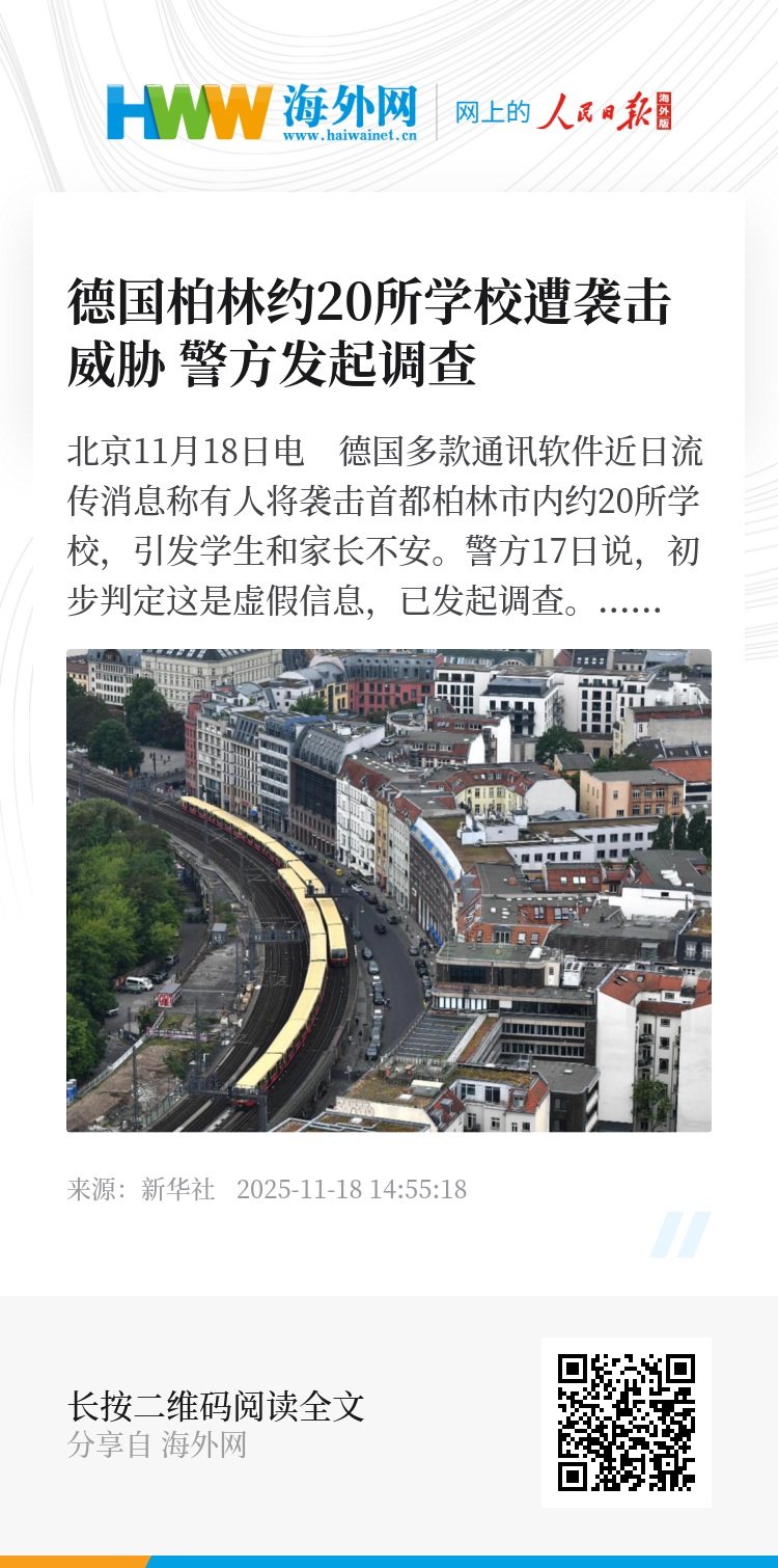 新华社北京11月18日电 德国多款通讯软件近日流传消息称有人将袭击首都柏林市内约20所学校,引发学生和家长不安。警方17日说,初步判定这是虚假信息,已发起调查。
