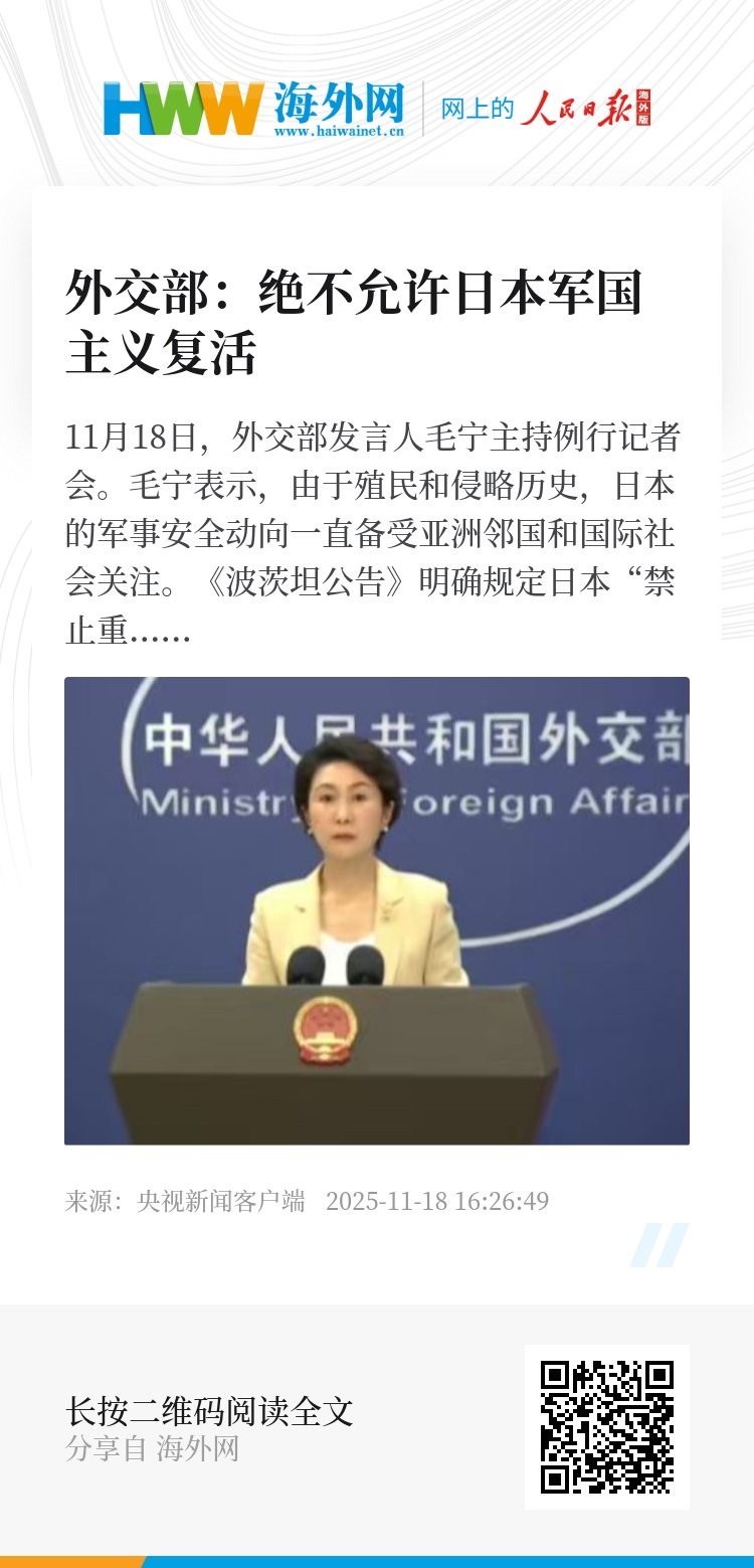 毛宁指出,80年前,日本军国主义发动侵略战争,给亚洲和世界带来深重灾难。忘战必危、好战必亡。历史的教训不能忘却,不可歪曲,更不容抹杀。80年后的今天,我们绝不允许日本军国主义复活,绝不允许任何人挑战战后国际秩序,绝不允许世界和平稳定再遭破坏。