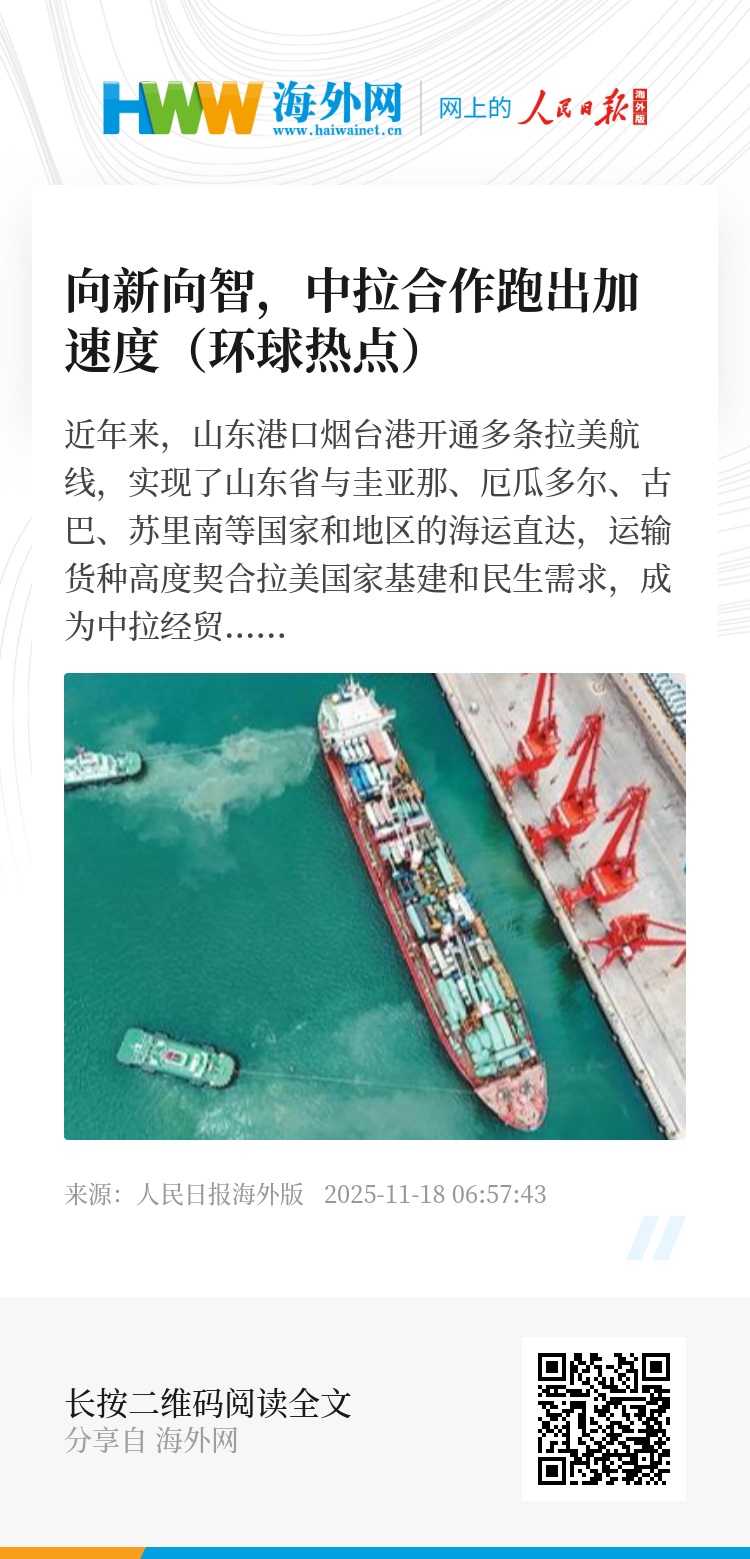 《2025年拉丁美洲经济展望》还将2024年启用的秘鲁钱凯港列为典型案例。作为中国在该地区最大规模投资项目,钱凯港每年将为秘鲁带来45亿美元收入,同时创造8000多个直接就业岗位。经过一年发展,钱凯港已将服务覆盖至哥伦比亚、智利、厄瓜多尔,为拉美各国提供更加多元的海运选择。