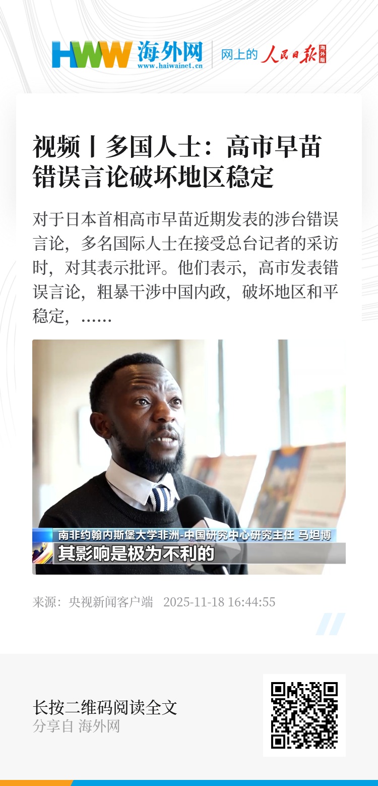 对于日本首相高市早苗近期发表的涉台错误言论,多名国际人士在接受总台记者的采访时,对其表示批评。他们表示,高市发表错误言论,粗暴干涉中国内政,破坏地区和平稳定,严重违背一个中国原则。