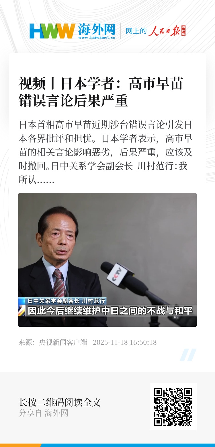 日中关系学会副会长 川村范行:战后日本制定了和平宪法,不发动战争并向国际社会承诺共同维护和平。尤其是与中国之间,日本在过去80年里从未发生过战争,这是极为宝贵的。也就是说两国保持了80年的不战和平,这是双方共同努力的结果。因此今后继续维护中日之间的不战与和平对日本来说十分重要。这次高市的发言使人们对(日本政府的)方向性产生严重疑问。高市首相指示要重新审视武器出口的“五项原则”,这也是非常危险的事情。
