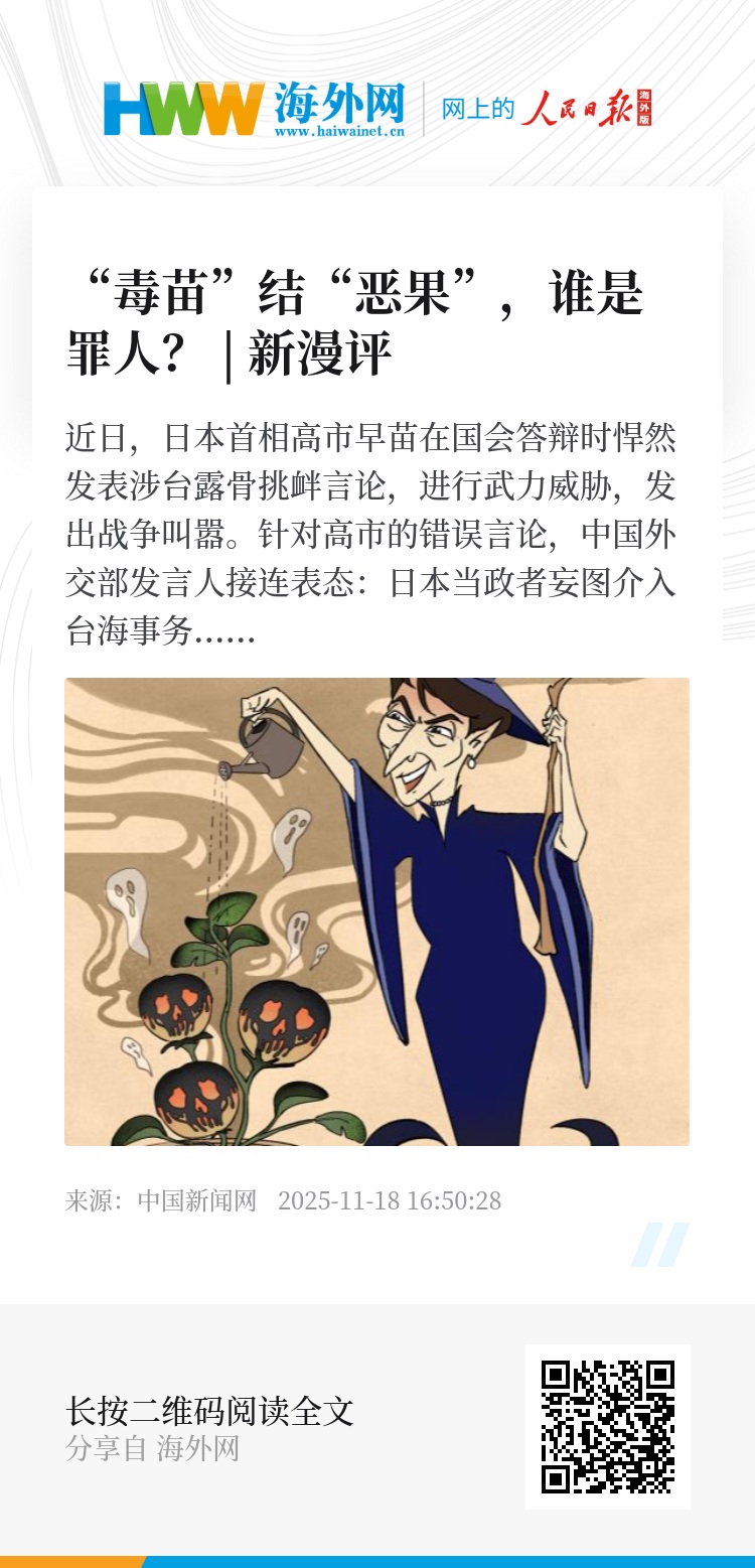 近日,日本首相高市早苗在国会答辩时悍然发表涉台露骨挑衅言论,进行武力威胁,发出战争叫嚣。