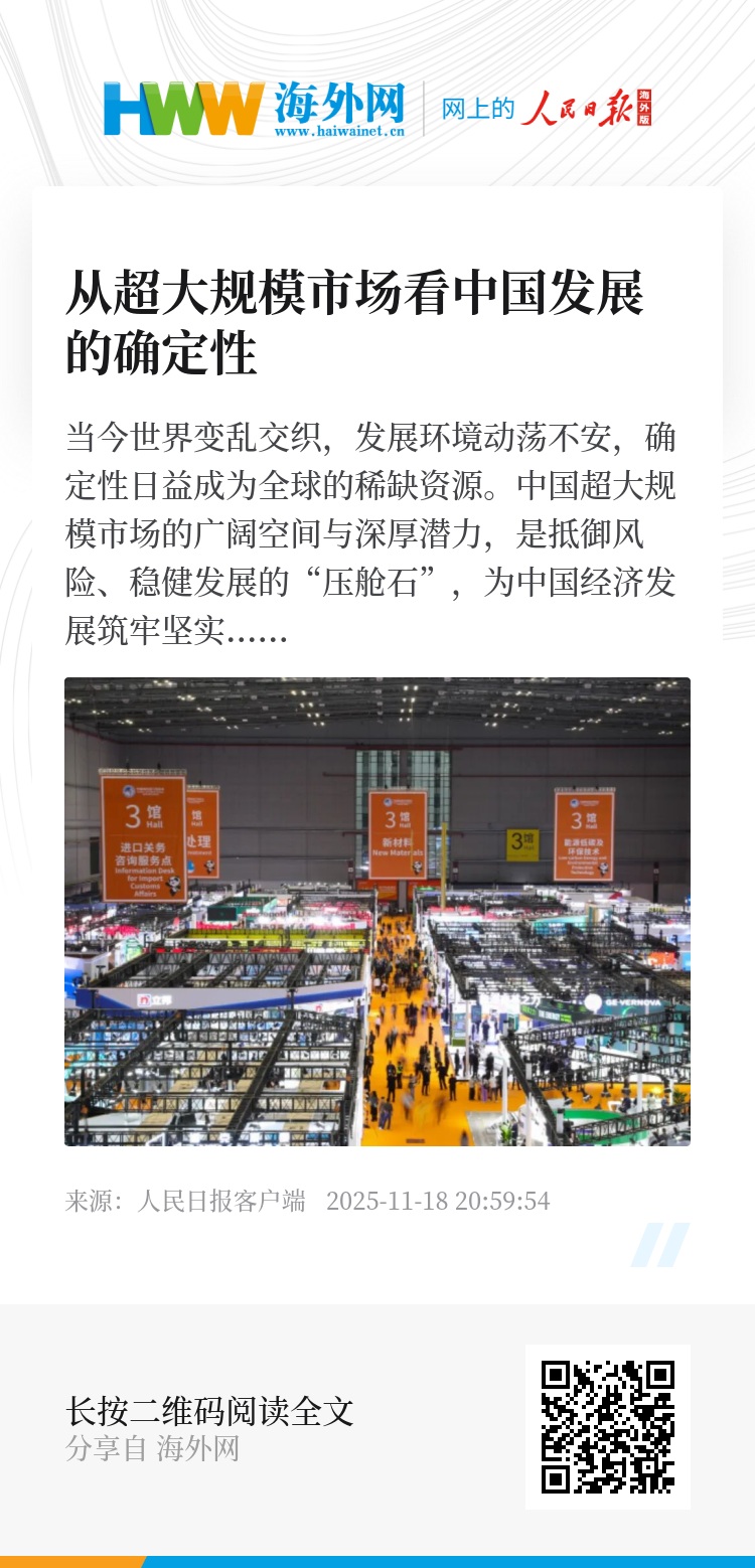 中国超大规模市场的广阔空间与深厚潜力,是抵御风险、稳健发展的“压舱石”,为中国经济发展筑牢坚实的确定性。