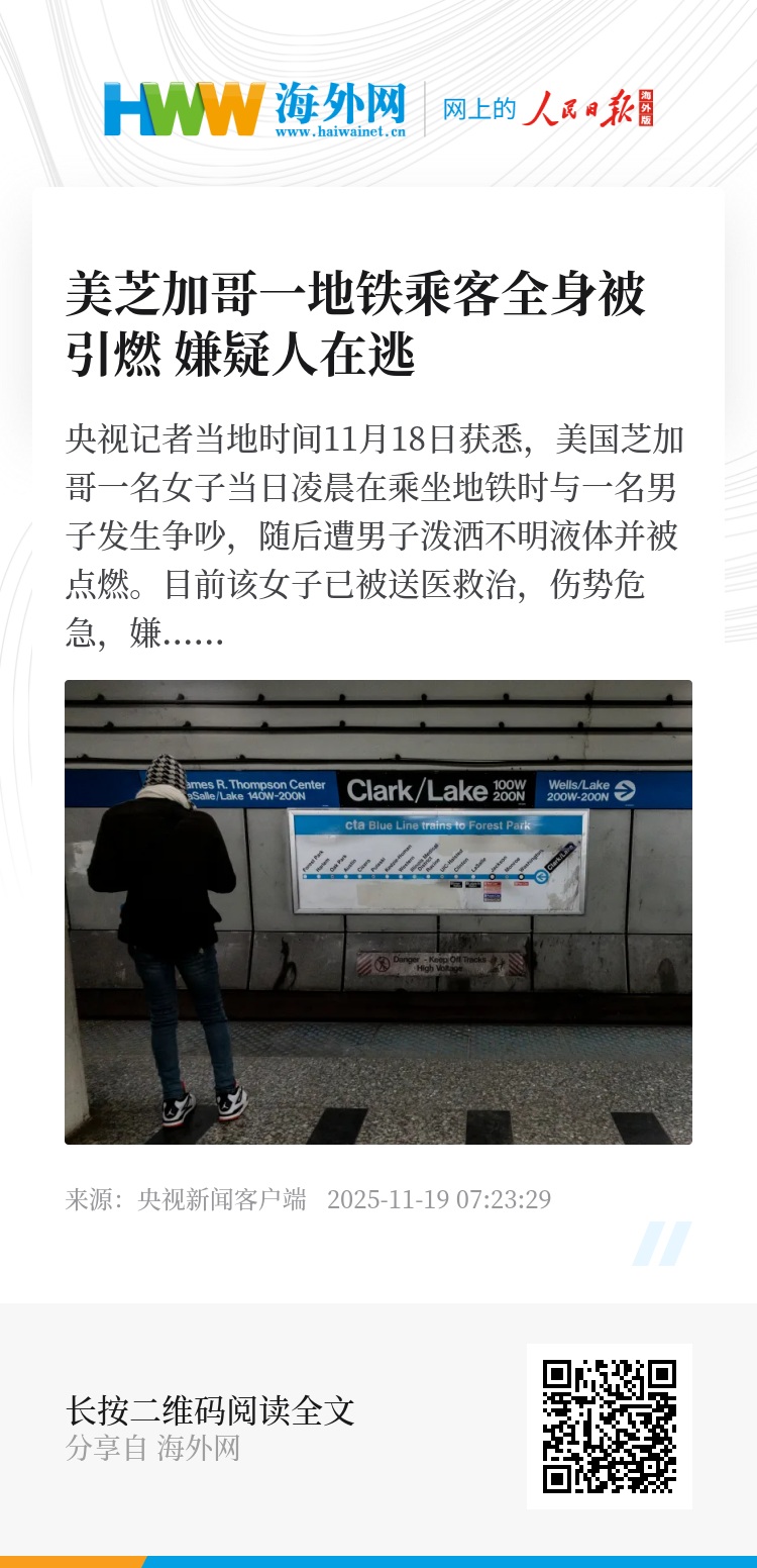 央视记者当地时间11月18日获悉,美国芝加哥一名女子当日凌晨在乘坐地铁时与一名男子发生争吵,随后遭男子泼洒不明液体并被点燃。目前该女子已被送医救治,伤势危急,嫌疑人仍在逃。