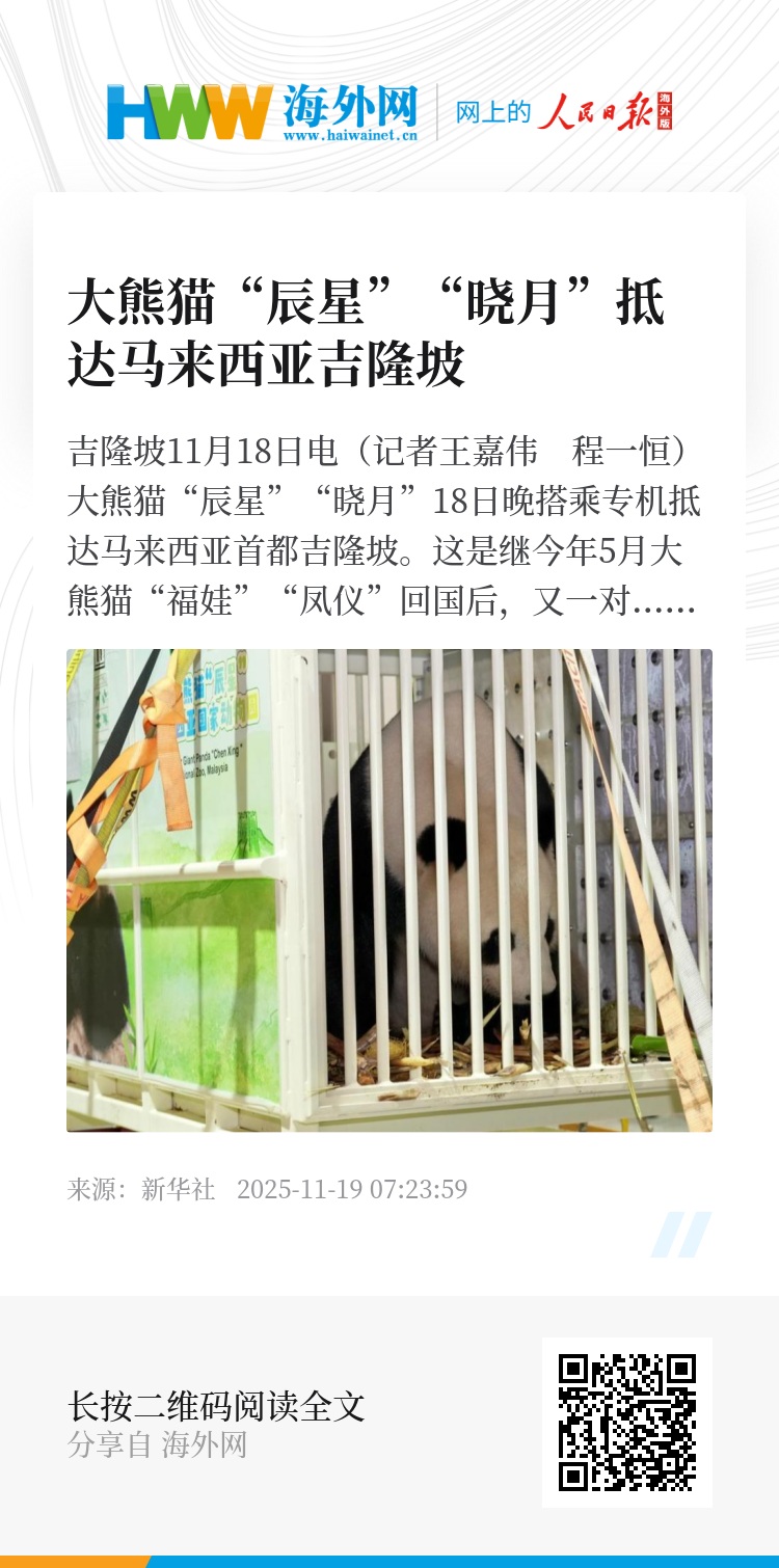 新华社吉隆坡11月18日电(记者王嘉伟 程一恒)大熊猫“辰星”“晓月”18日晚搭乘专机抵达马来西亚首都吉隆坡。这是继今年5月大熊猫“福娃”“凤仪”回国后,又一对大熊猫前往马来西亚国家动物园旅居,开启新一轮为期10年的中马大熊猫保护合作研究。