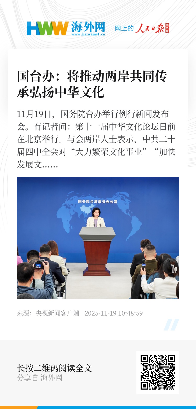 发言人朱凤莲表示,两岸同胞同根同源、同文同种,都讲中国话、写中国字、食中国味、过中国节,中华文化是两岸同胞心灵的根脉和归属。中共二十届四中全会对“大力繁荣文化事业”“加快发展文化产业”作出重要部署,同时指出“深化两岸交流合作,共同传承弘扬中华文化”,为推动两岸文化交流合作擘画了光明前景、注入了强劲动能。