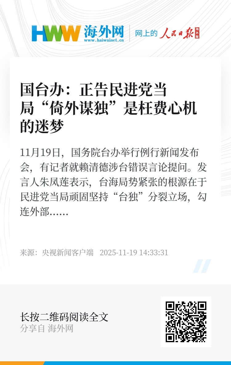 发言人朱凤莲表示,台海局势紧张的根源在于民进党当局顽固坚持“台独”分裂立场,勾连外部势力进行谋“独”挑衅。大家已经看到,近期有许多外国媒体、专家、学者发声批评赖清德当局鲁莽冒进,一再进行谋“独”挑衅,是台海“和平破坏者”“麻烦制造者”。正告民进党当局,“倚外谋独”是枉费心机的迷梦,任何勾连外部势力进行谋“独”挑衅的行径都必将遭到迎头痛击,任何数典忘祖、背弃民族的人都将被钉在历史的耻辱柱上。(总台央视记者 黄达 黄惠馨)