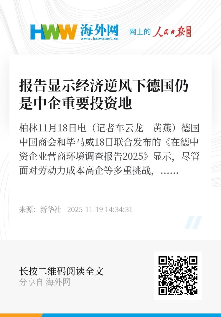 新华社柏林11月18日电(记者车云龙 黄燕)德国中国商会和毕马威18日联合发布的《在德中资企业营商环境调查报告2025》显示,尽管面对劳动力成本高企等多重挑战,德国仍是中国企业在欧洲布局的重要投资目的地。报告认为,德方通过优化营商环境有望吸引更多中国投资,并进一步拓展合作空间。