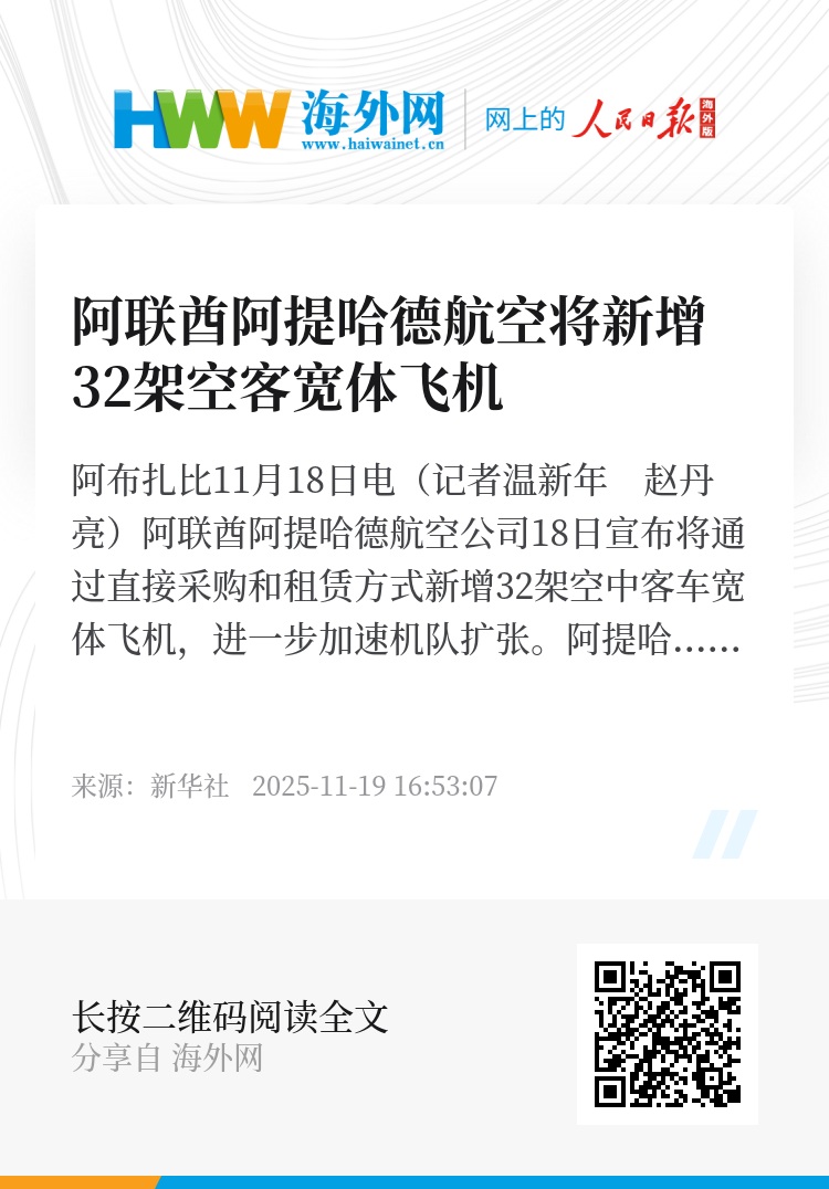 新华社阿布扎比11月18日电(记者温新年 赵丹亮)阿联酋阿提哈德航空公司18日宣布将通过直接采购和租赁方式新增32架空中客车宽体飞机,进一步加速机队扩张。