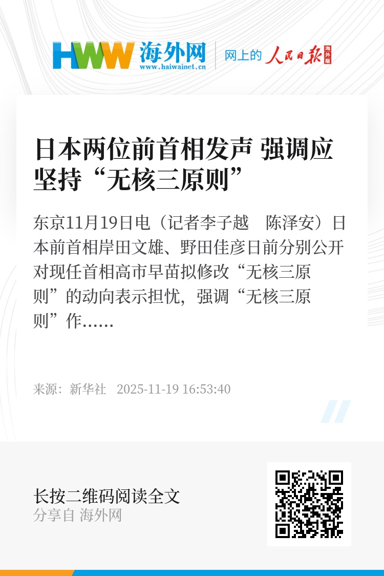 新华社东京11月19日电(记者李子越 陈泽安)日本前首相岸田文雄、野田佳彦日前分别公开对现任首相高市早苗拟修改“无核三原则”的动向表示担忧,强调“无核三原则”作为日本国策不可改变。