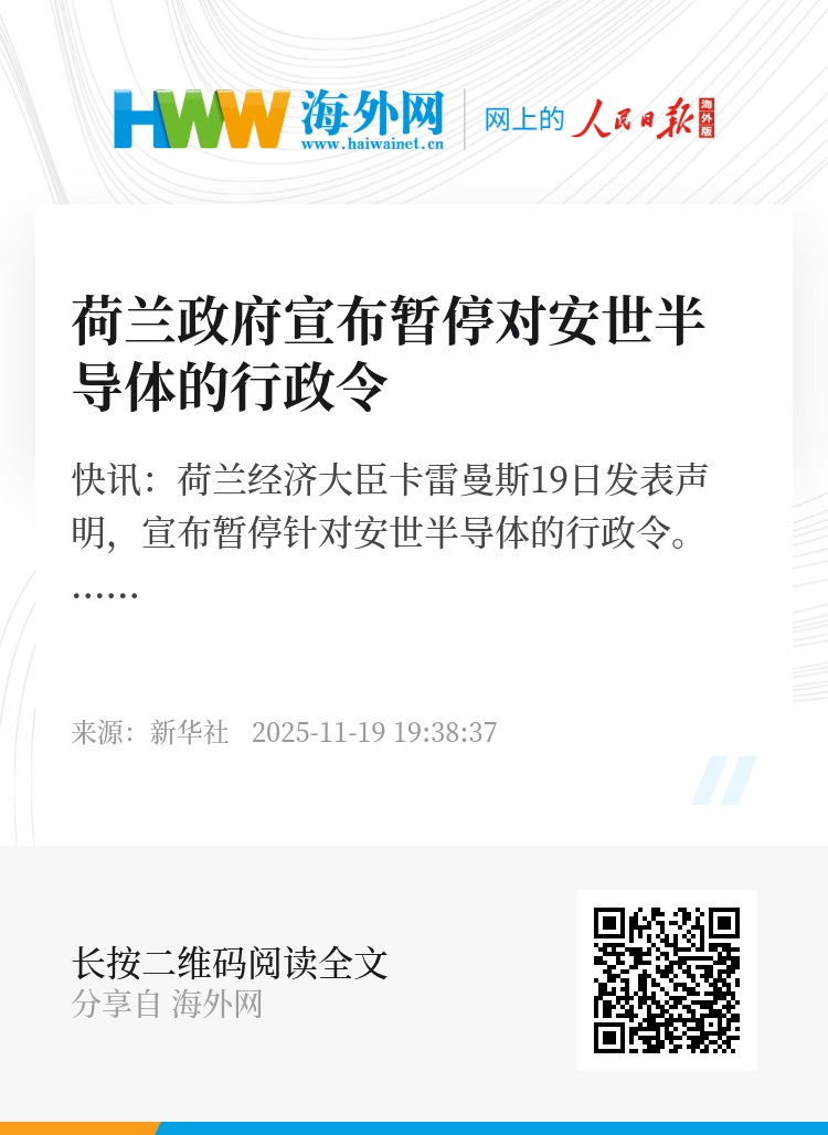 新华社快讯:荷兰经济大臣卡雷曼斯19日发表声明,宣布暂停针对安世半导体的行政令。