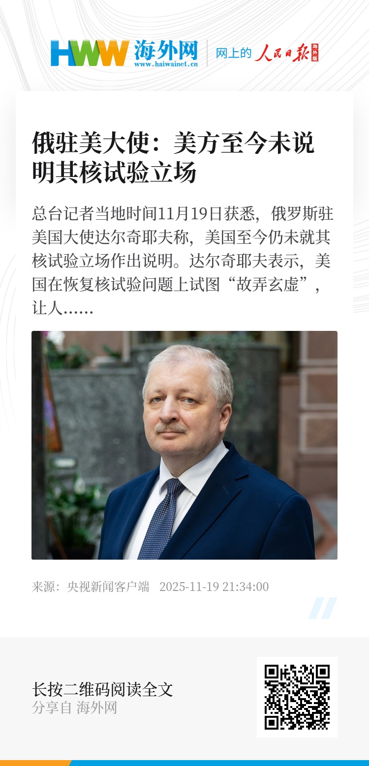 总台记者当地时间11月19日获悉,俄罗斯驻美国大使达尔奇耶夫称,美国至今仍未就其核试验立场作出说明。达尔奇耶夫表示,美国在恢复核试验问题上试图“故弄玄虚”,让人怀疑其是否采取负责任的态度。