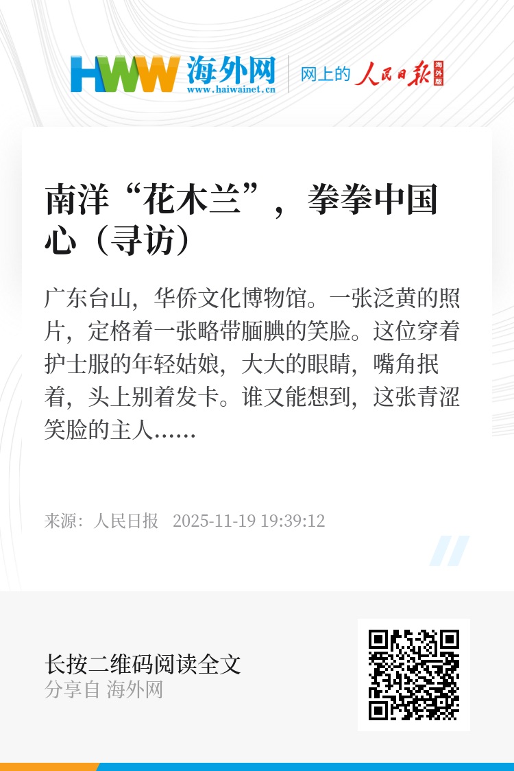 广东台山,华侨文化博物馆。一张泛黄的照片,定格着一张略带腼腆的笑脸。这位穿着护士服的年轻姑娘,大大的眼睛,嘴角抿着,头上别着发卡。谁又能想到,这张青涩笑脸的主人,曾是一名女扮男装、支援抗日的“花木兰”?