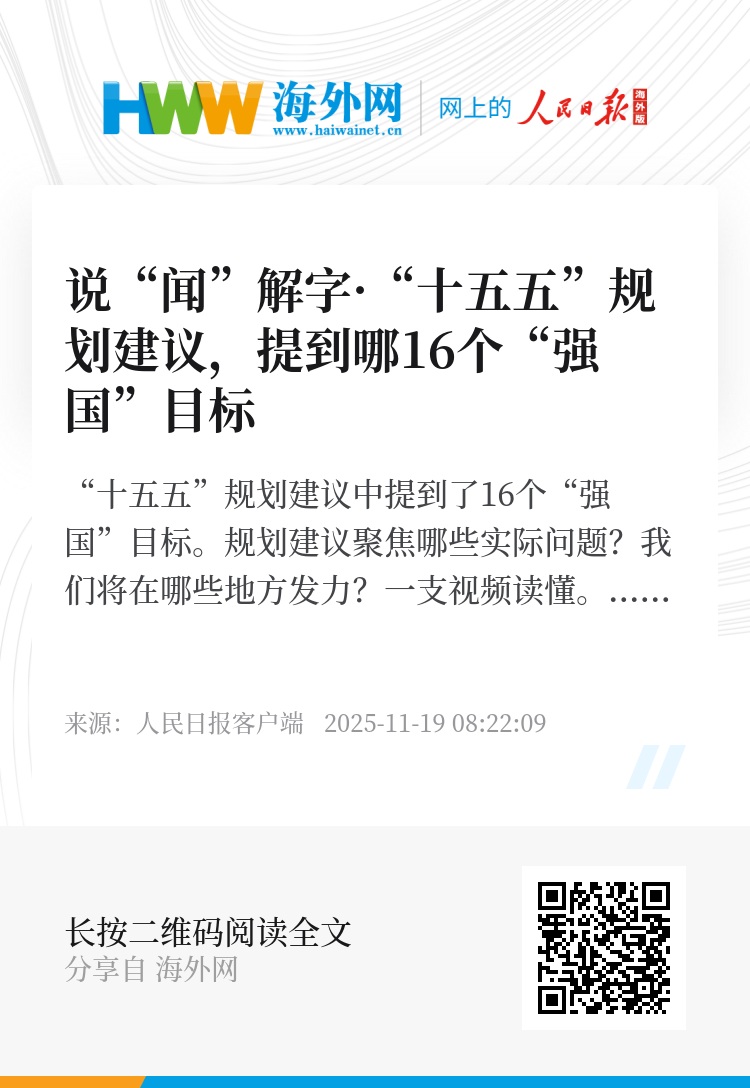 “十五五”规划建议中提到了16个“强国”目标。规划建议聚焦哪些实际问题?我们将在哪些地方发力?一支视频读懂。