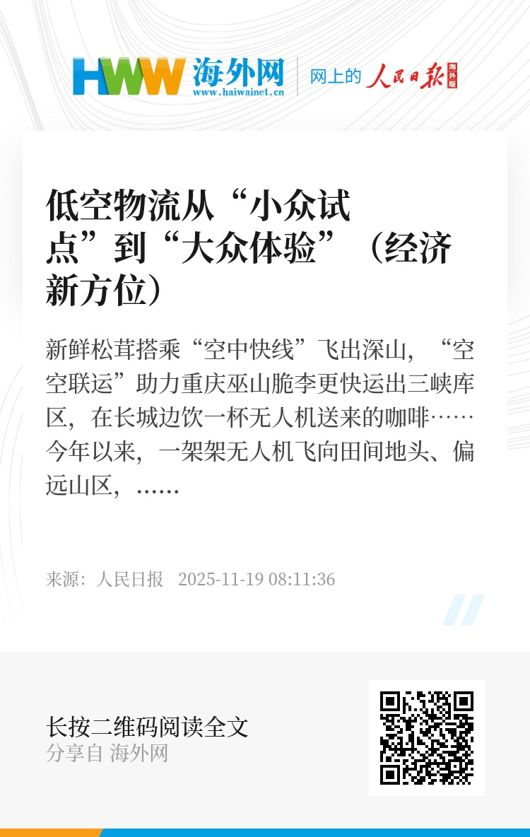 7公里仅需10分钟,山东济南首条空中物流线路比陆运效率提升60%以上;转运时间从1小时压缩至8分钟,无人机运输巫山脆李让“今日下单,明日见李”成为现实……