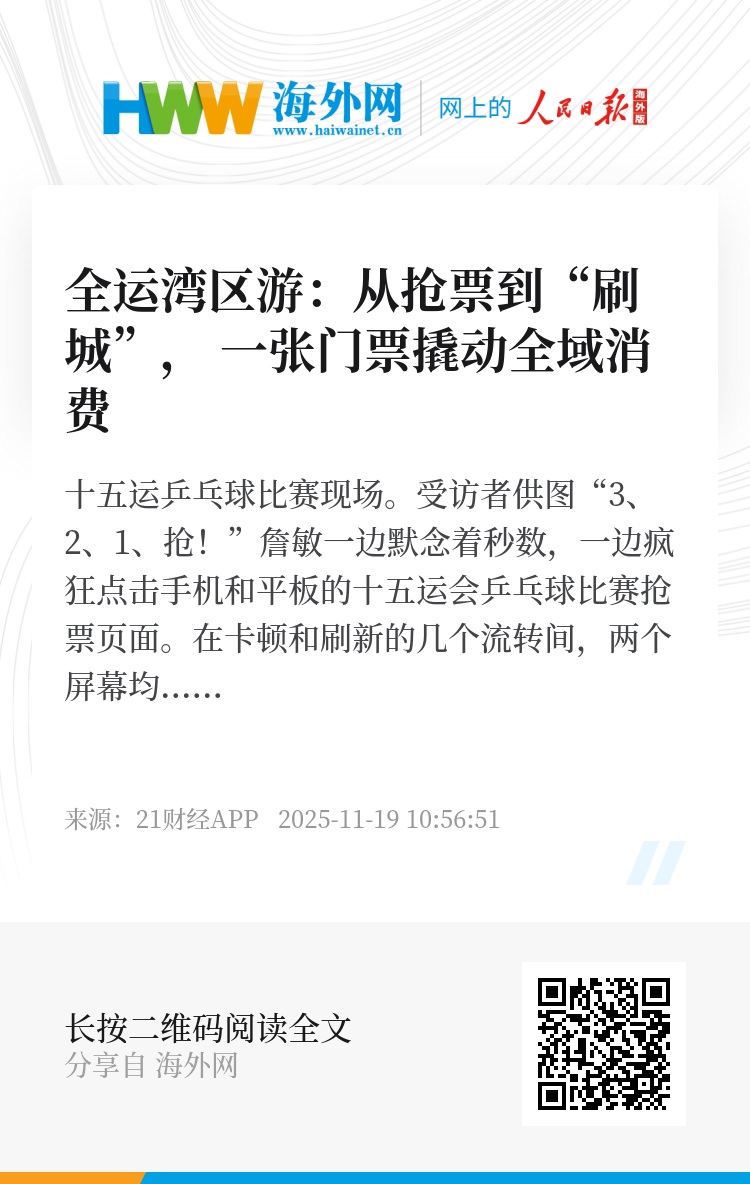 “我和姐姐约好下周末去泡温泉,继续用票根‘回血’。如果深圳、东莞等地再开放热门赛事售票,我打算带爸妈一起,干脆请几天年假,把大湾区‘全运周边城市’刷一遍。”詹敏兴致勃勃地规划,白天看比赛,晚上吃烧鹅,还能“折上折”游玩景点,这才是“体育+文旅”的正确打开方式。