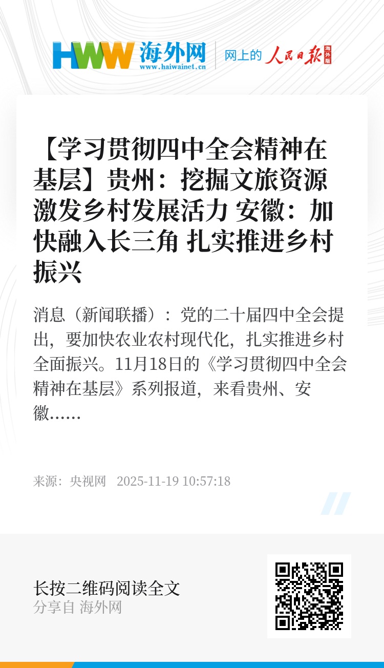 央视网消息(新闻联播):党的二十届四中全会提出,要加快农业农村现代化,扎实推进乡村全面振兴。11月18日的《学习贯彻四中全会精神在基层》系列报道,来看贵州、安徽以全会精神为指引,立足各自优势,挖掘特色文旅资源、依托区域一体化发展等,激发乡村全面振兴新活力。