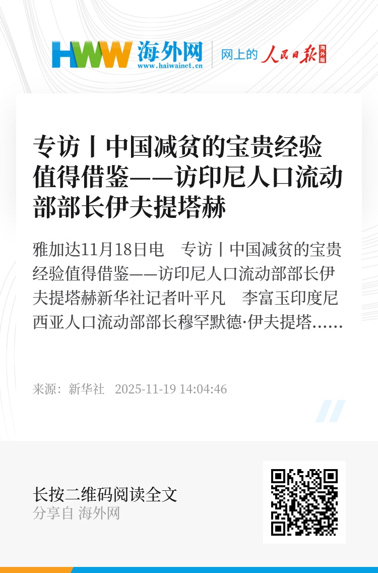 新华社雅加达11月18日电 专访丨中国减贫的宝贵经验值得借鉴——访印尼人口流动部部长伊夫提塔赫