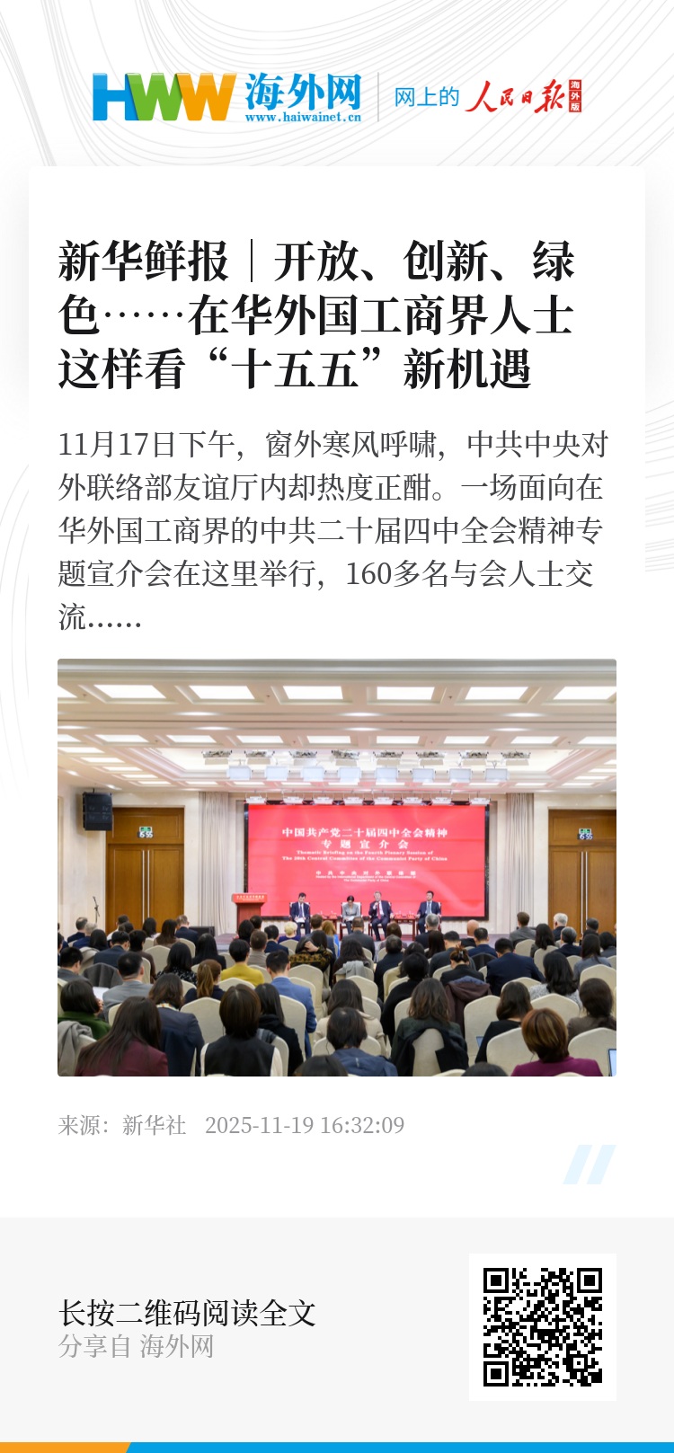 一个月来,不少在华外国商协会、跨国企业代表和驻华使馆经贸官员都已经深入研读了“十五五”规划建议。在他们眼中,“高水平对外开放”“贸易创新”“现代化产业体系”“绿色转型”等一系列“十五五”热词,意味着所在行业、企业与中方合作的新机遇、新动能。