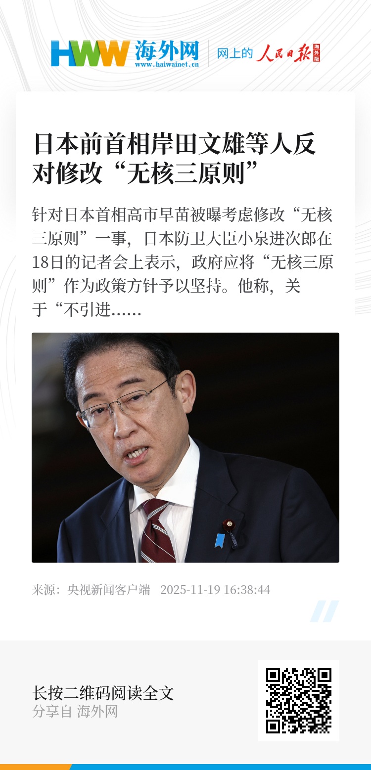 日本前首相岸田文雄在接受采访时表示,不对媒体报道内容进行推测性评论,但自担任首相时起,他就已明确表示,将延续历届政府的立场,继续把“不拥有、不制造、不引进核武器”的“无核三原则”作为国策,这一态度至今没有改变。