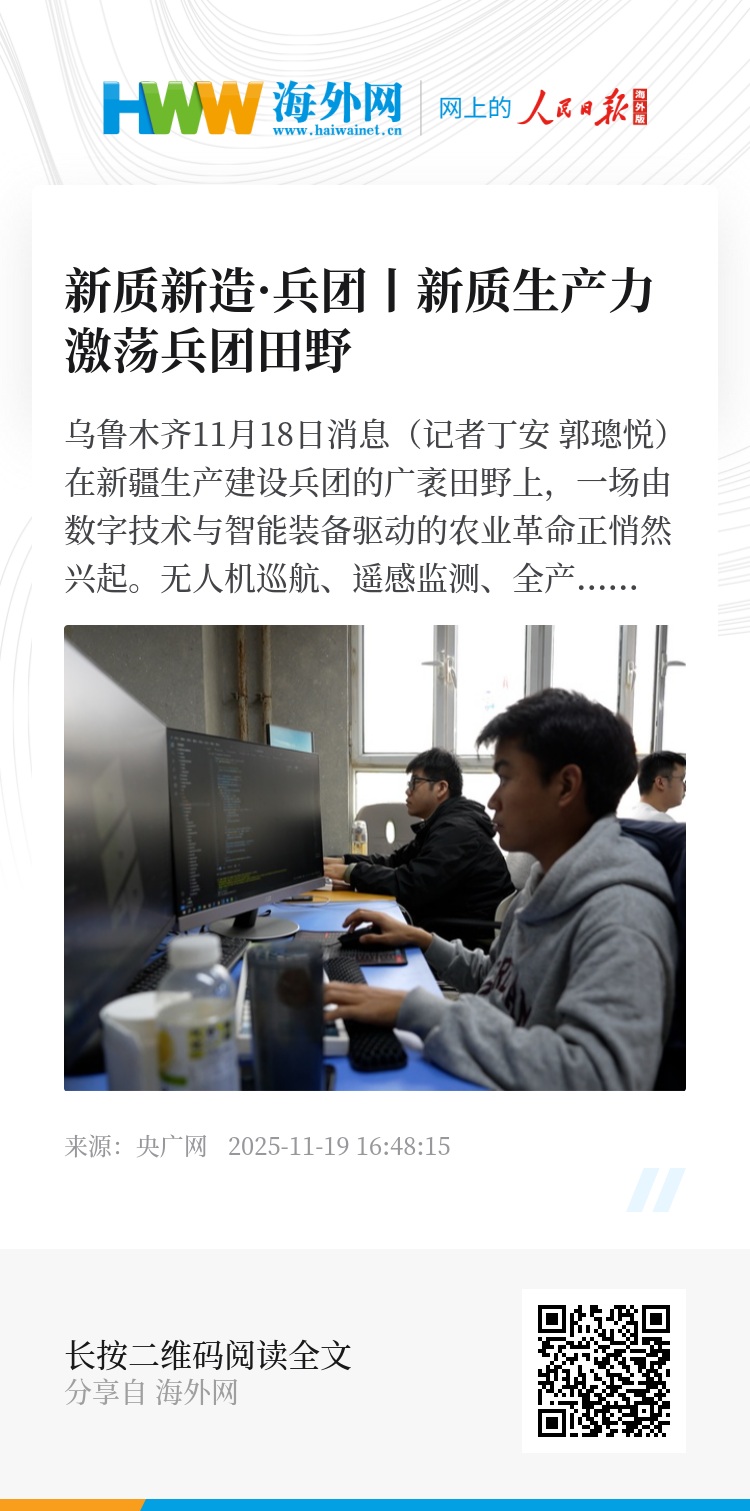 从遥感监测到智能装备,从单点示范到系统重构,兵团正以新质生产力重塑农业未来。在这片热土上,科技与土地的深度融合,正在书写着农业高质量发展的新时代答卷。