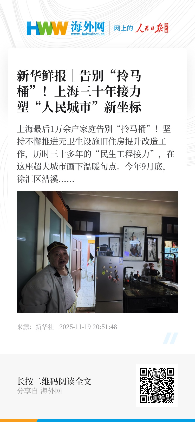 上海最后1万余户家庭告别“拎马桶”!坚持不懈推进无卫生设施旧住房提升改造工作,历时三十多年的“民生工程接力”,在这座超大城市画下温暖句点。