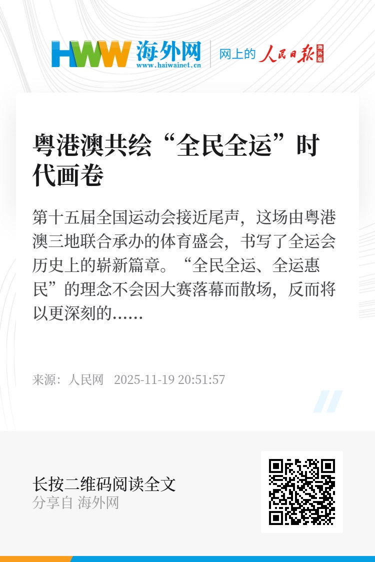 从珠江之畔到南海之滨,十五运会以体育为纽带,将粤港澳三地紧紧相连,更将“全民全运、全运惠民”的理念推向新的高度。以十五运会为起点,“全民全运”的种子将在更广袤的土地生根发芽,体育强国的梦想也将在亿万人民的参与中照进现实。(人民网记者 欧兴荣)