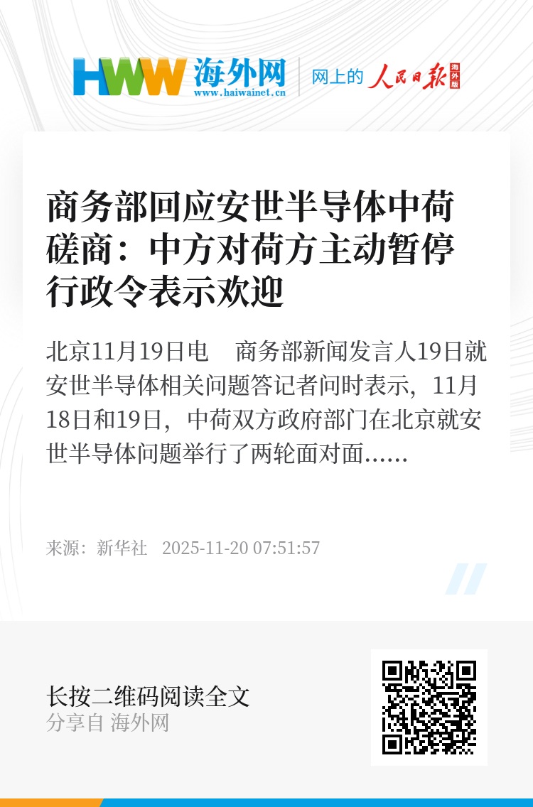 有记者问:有关安世半导体问题,中国和荷兰之间近期的磋商情况如何?商务部新闻发言人对此作出上述回应。
