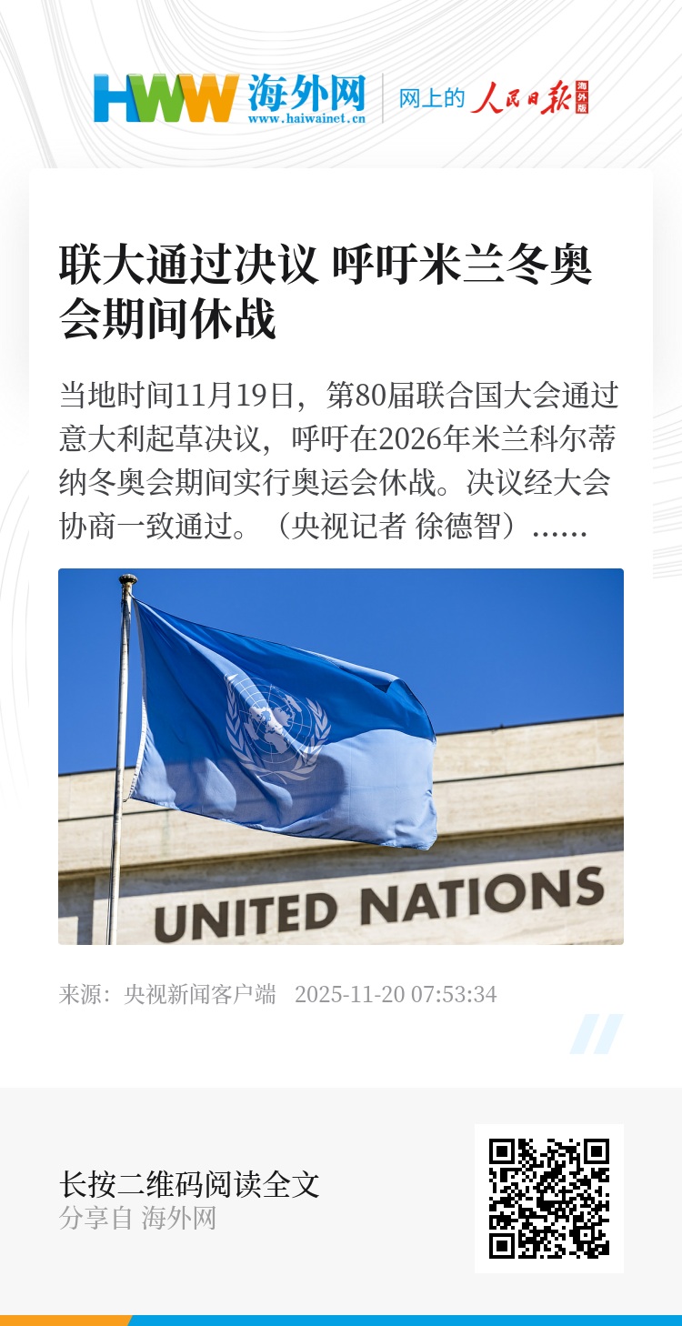 当地时间11月19日,第80届联合国大会通过意大利起草决议,呼吁在2026年米兰科尔蒂纳冬奥会期间实行奥运会休战。决议经大会协商一致通过。(央视记者 徐德智)